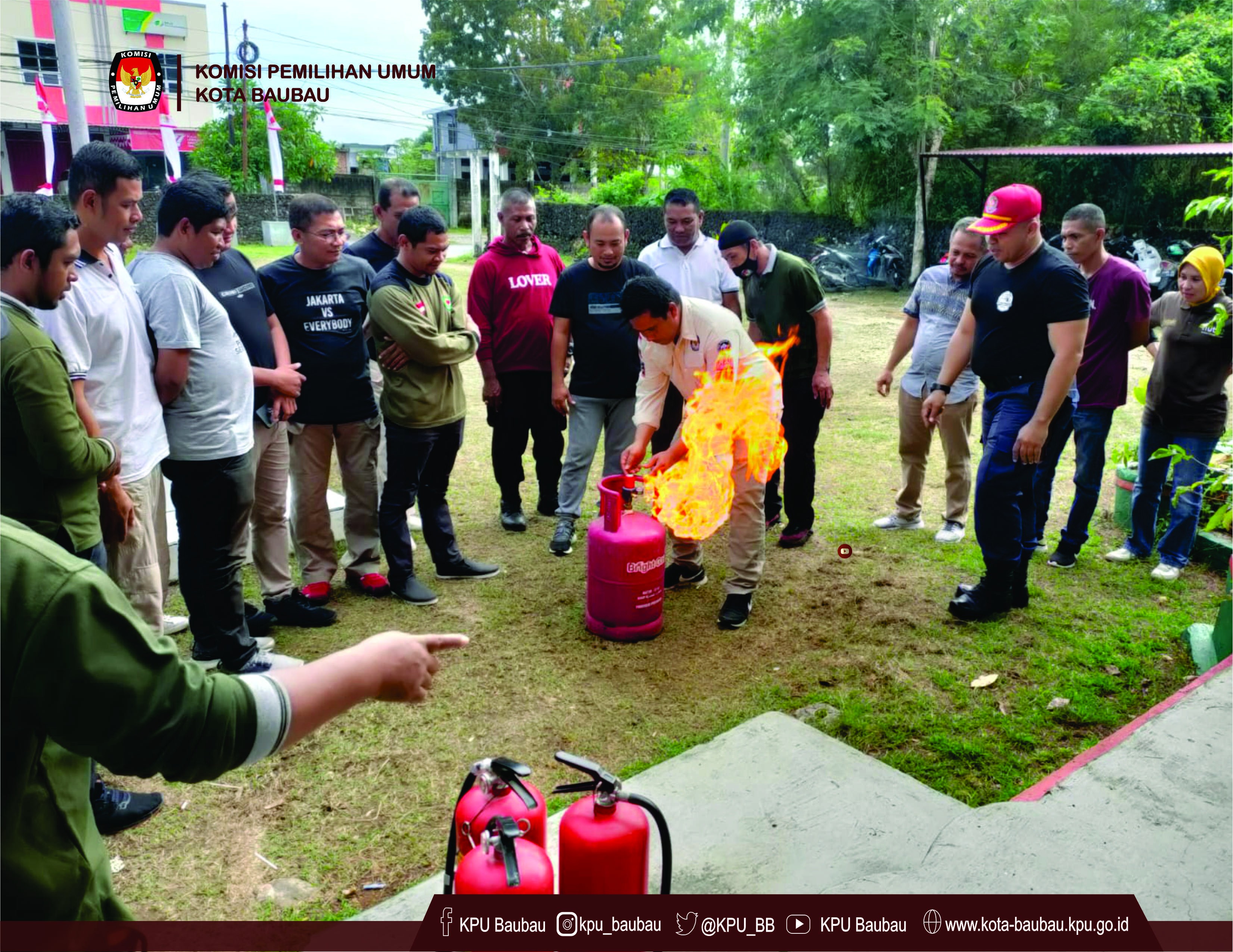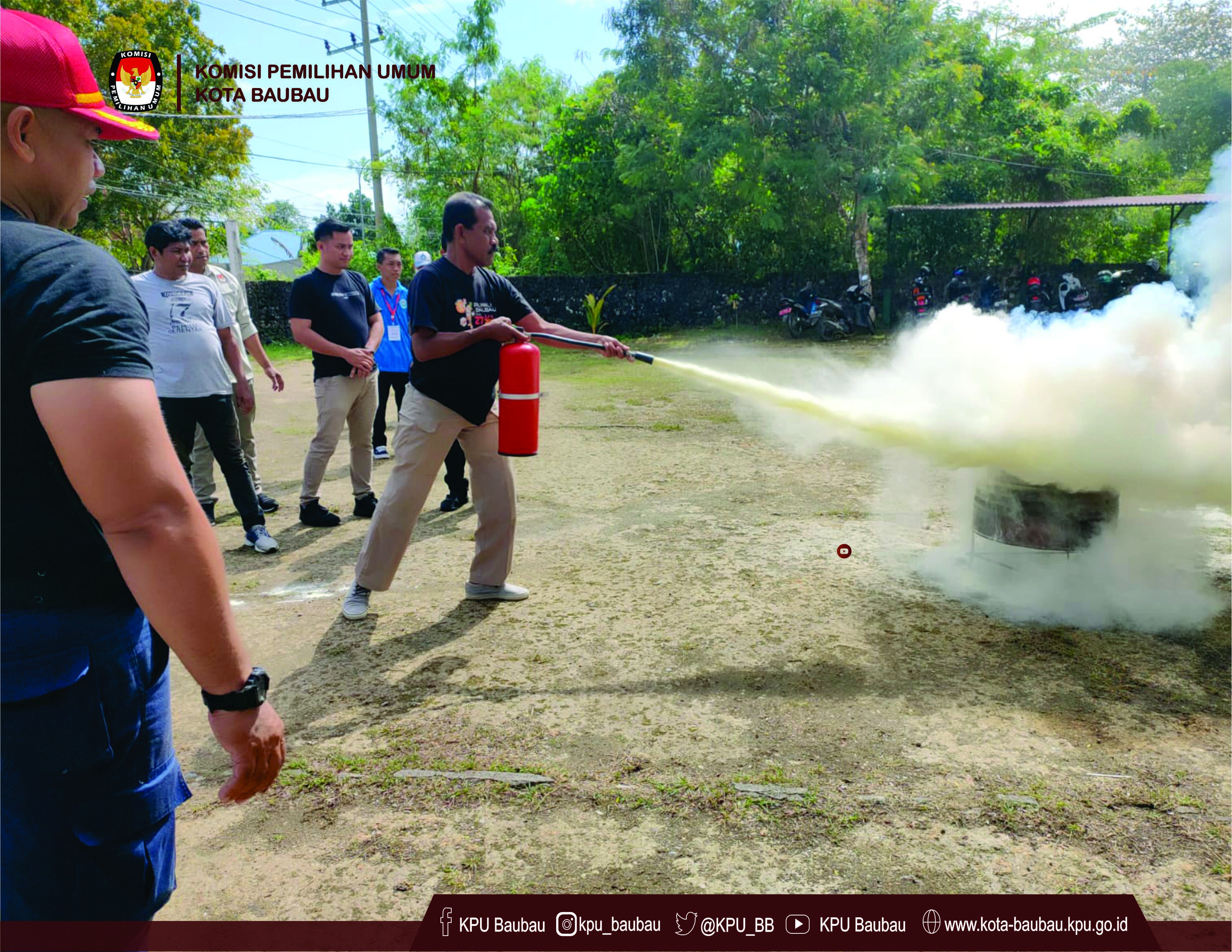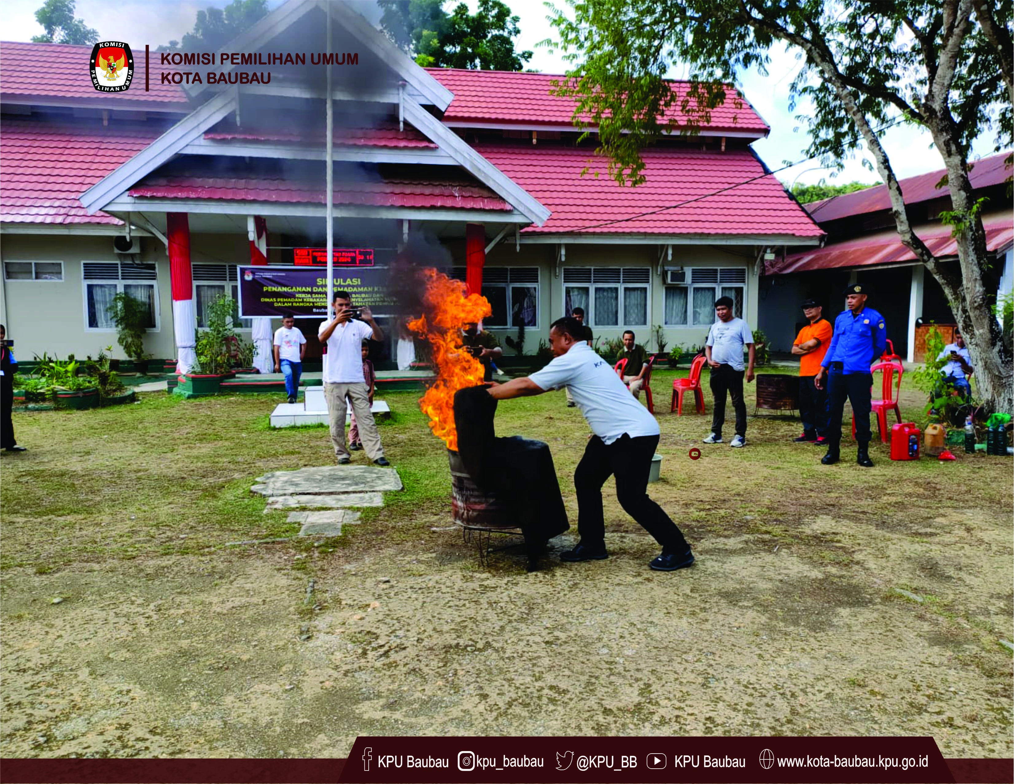Terlihat seluruh personil KPU Baubau aktif mengikuti simulasi pemadaman kebakaran. Secara bergantian mempraktekkan cara memadamkan api, baik yang sumbernya dari tabung gas maupun api simulasi yang dibuat dari bahan bakar minyak. Alat yang digunakan karung basah dan Apar.