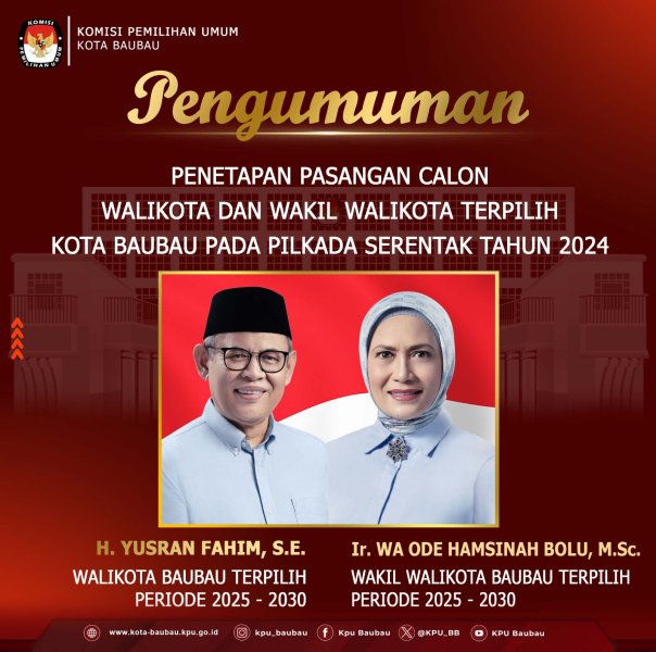 - Pengumuman Nomor 86/PL.02.7-Pu/7472/2/2025 tentang Penetapan Pasangan Calon Walikota dan Wakil Walikota Baubau Terpilih dalam Pemilihan Walikota dan Wakil Walikota Baubau Tahun 2024
