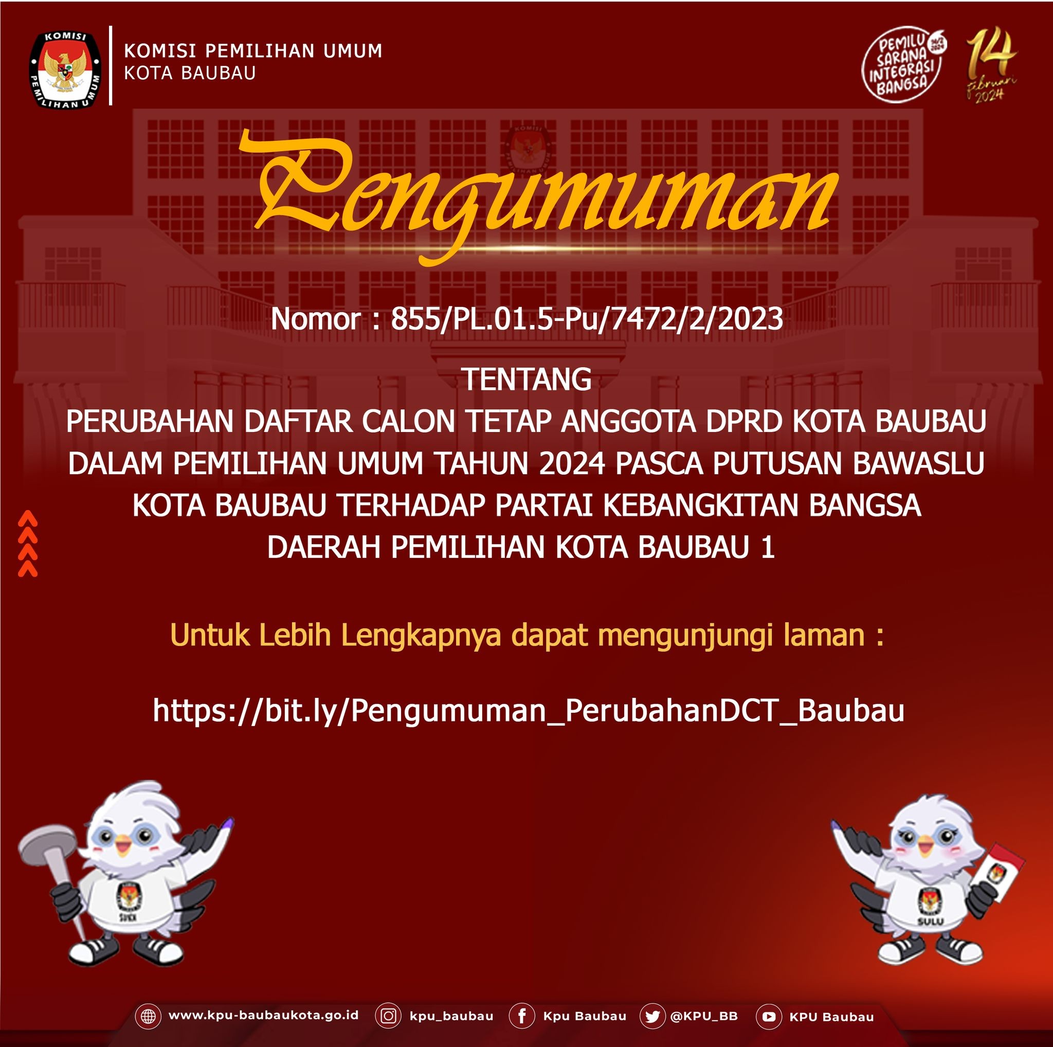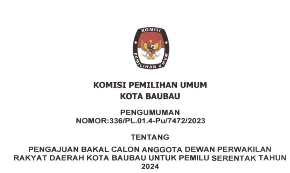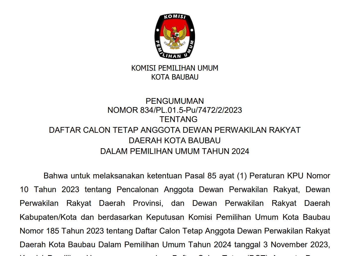 Penetapan DCT Anggota DPRD Kota Baubau melalui Keputusan Komisi Pemilihan Umum Kota Baubau Nomor 185 Tahun 2023 tentang Daftar Calon Tetap Anggota Dewan Perwakilan Rakyat Daerah Kota Buabau dalam Pemilihan Umum Tahun 2024.